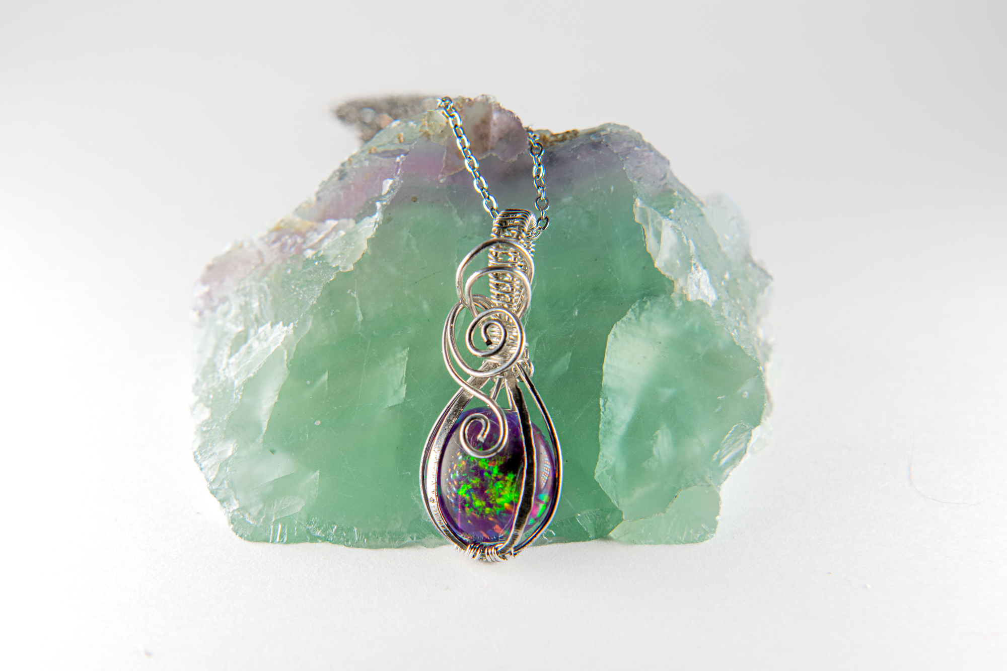 This vibrant Bello Opal was shaped and polished by hand, and wrapped meticulously in a Sterling Silver wire casing. Capturing a sliver of the galaxy, each angle of light captures a unique highlight color in the "fire", or play of color, of the opal. From deep purples and pinks, to bright orange yellows, to a stark neon green, this stone is bursting with character.